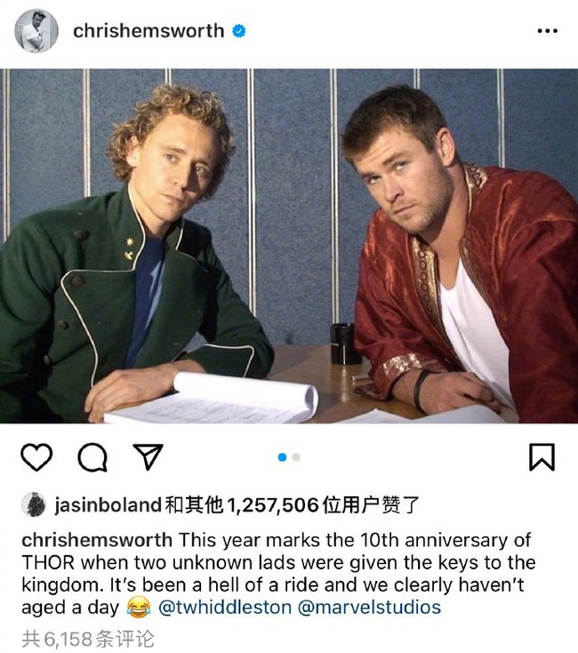 5月12日,“锤哥”克里斯·海姆斯沃斯晒出自己与“抖森”汤姆·希德勒斯顿的旧照,以及当年Vulture对选角的报道,纪念《雷神》上映十周年。