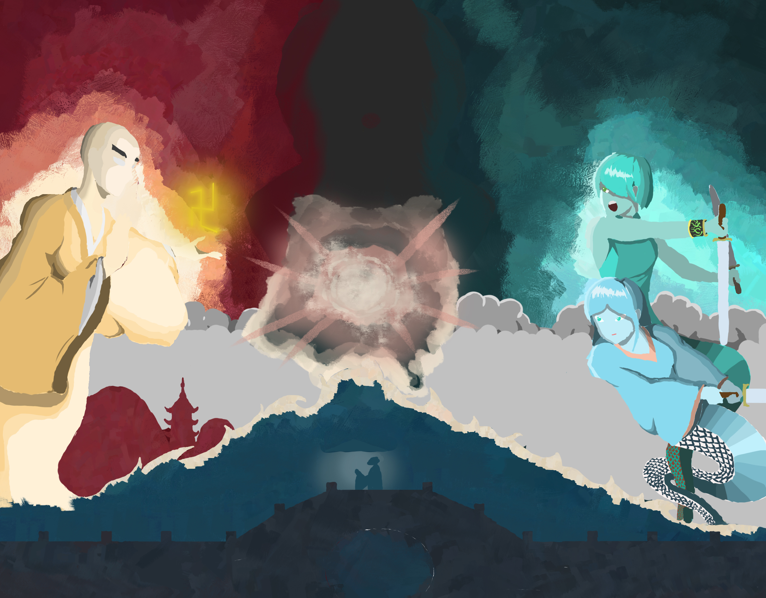 白素贞与小青大战法海,战斗的余波让天地变色,波涛汹涌,身为凡人的许仙却只能默默观战。