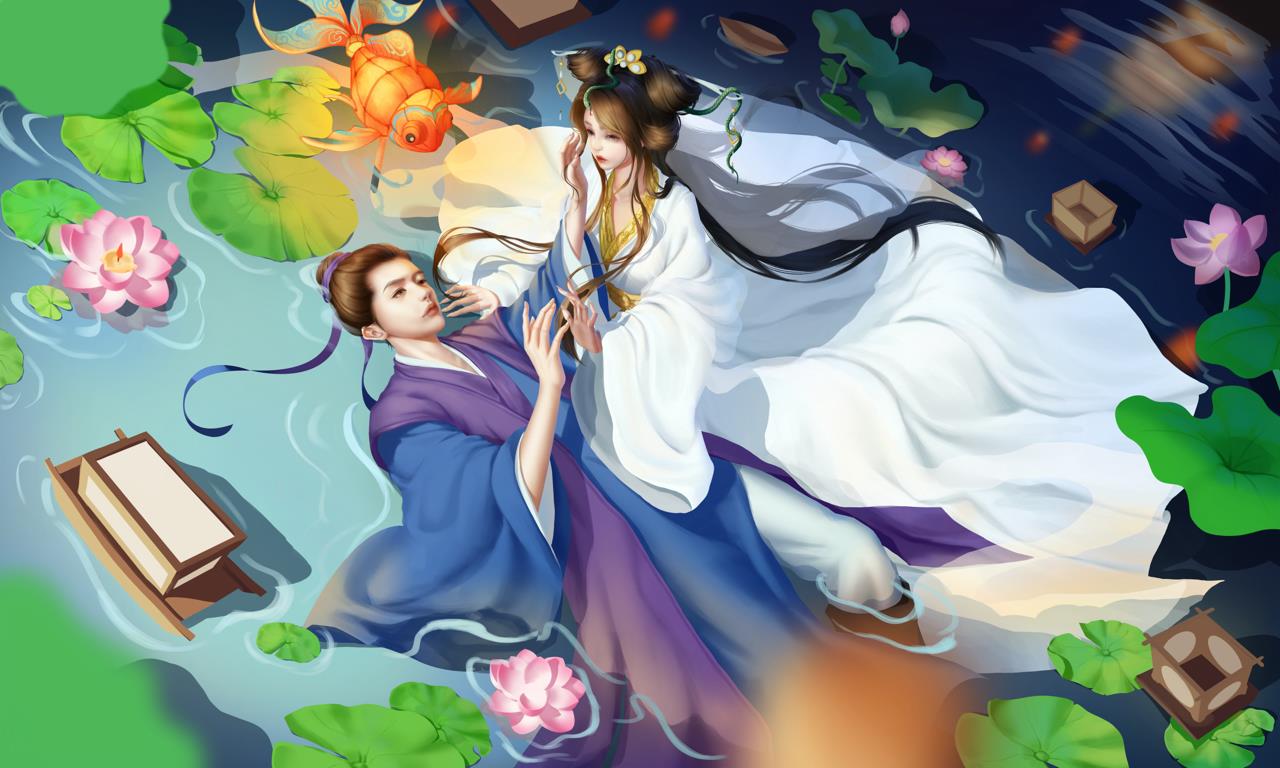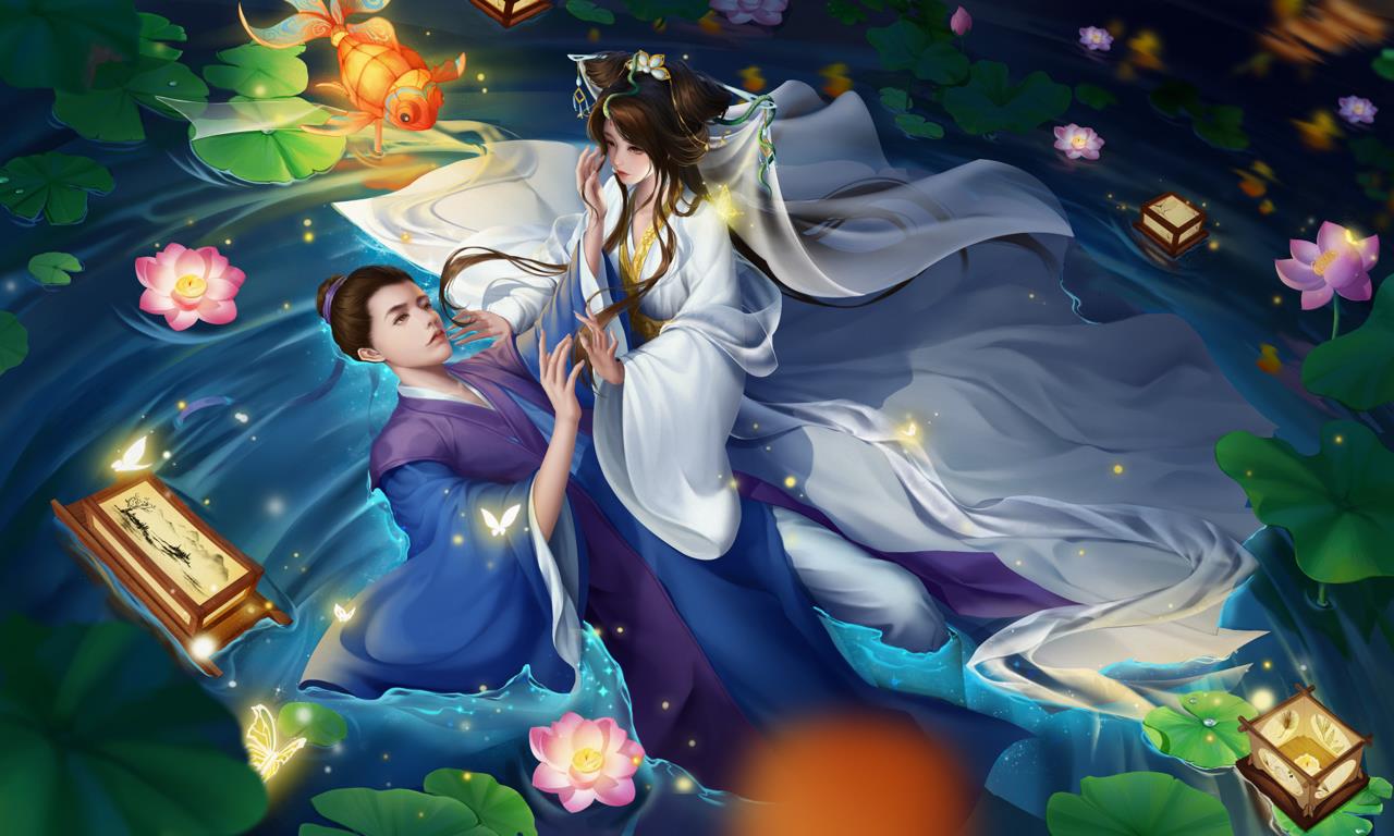在一个寂静的夜晚,月光如银洒落,荷花池中央被一片柔和的光辉所笼罩。池中的荷花娇艳欲滴,每一朵都似仙子般亭亭玉立。许仙驻足观赏,心中不禁赞叹大自然的神奇与美丽。就在此时,一道倩影从荷花丛中飘然而至,她身着白衣,宛如仙子下凡,正是传说中的白娘子。白娘子在荷花池中轻盈地穿梭,她的衣裙随着水波轻轻飘动,如同白色的云彩在碧波中起舞。仿佛有一种神奇的力量将他们牵引到了一起。他们彼此相视一笑,眼中充满了惊喜与好奇。许仙温文尔雅地向白娘子行礼问好,而白娘子则微笑着回应,她的声音如同天籁之音,让人陶醉其中。他们聊得很投机,仿佛有说不完的话题。许仙被白娘子的智慧和才情所折服,而白娘子也被许仙的儒雅和真诚所打动。在月光的映照下,两人的身影交织在一起,形成了一幅美丽的画面。