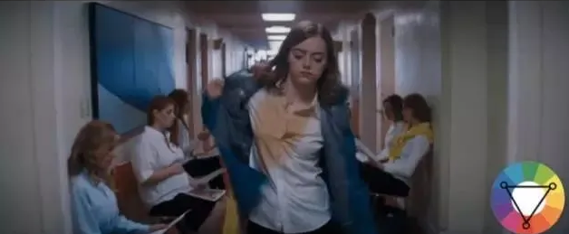 上面的镜头里,蓝色(女主的外套和左墙上的画),黄色(女主背包和右边女人的衣服)和红色(左边的椅子和背后偏红的墙面)形成三色对比,突出女主在面试前失意的情绪。