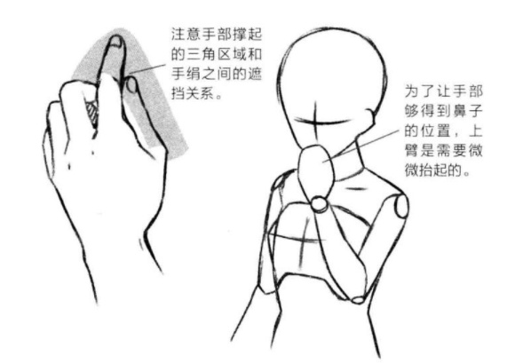 注意这里因为手部撑起从而产生的三角区以及和手绢存在的遮挡关系(如下图左所示)。还有为了让手能够触摸到鼻子,因此上臂是需要微抬的(如下图右)。